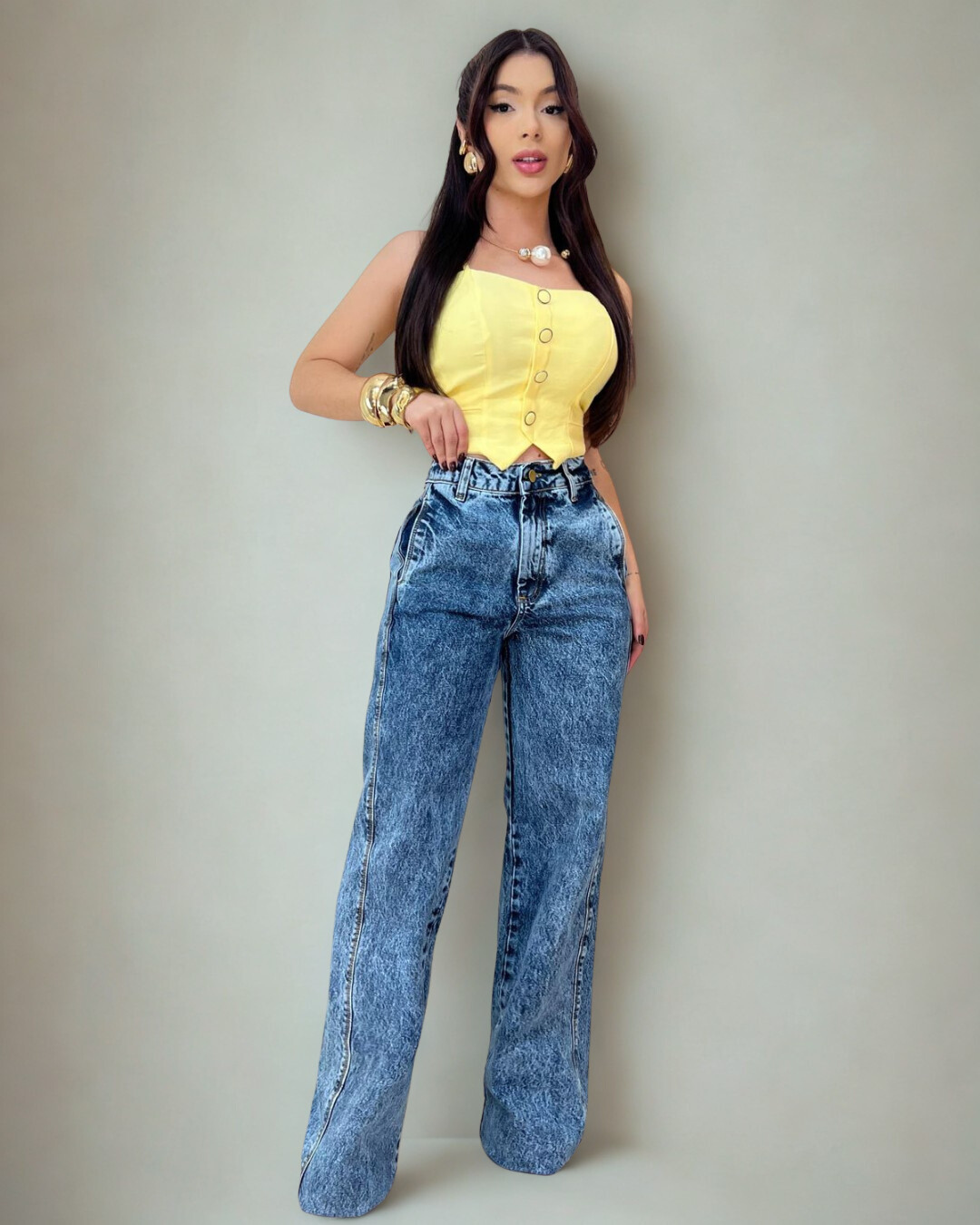 A Calça Wide Leg Jeans estilo Vintage é o equilíbrio perfeito entre estilo marcante e caimento impecável! Com modelagem ampla e cintura alta, essa peça entrega personalidade de sobra sem abrir mão do conforto.